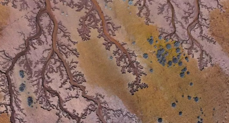 Ətraf ərazidən axan müxtəlif çayların birləşib gölə töküldüyü yerdə əmələ gələn cığırlar dron görüntülərində ağac budaqlarına bənzəyir.